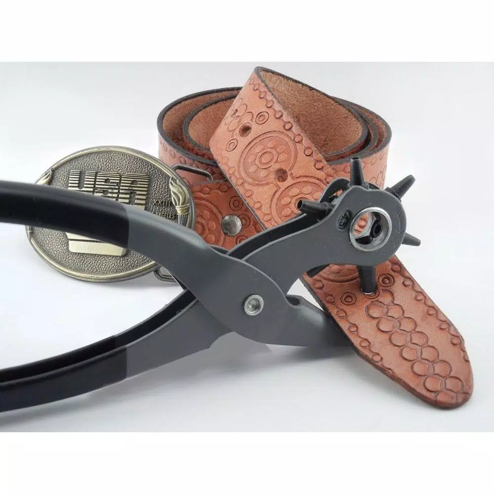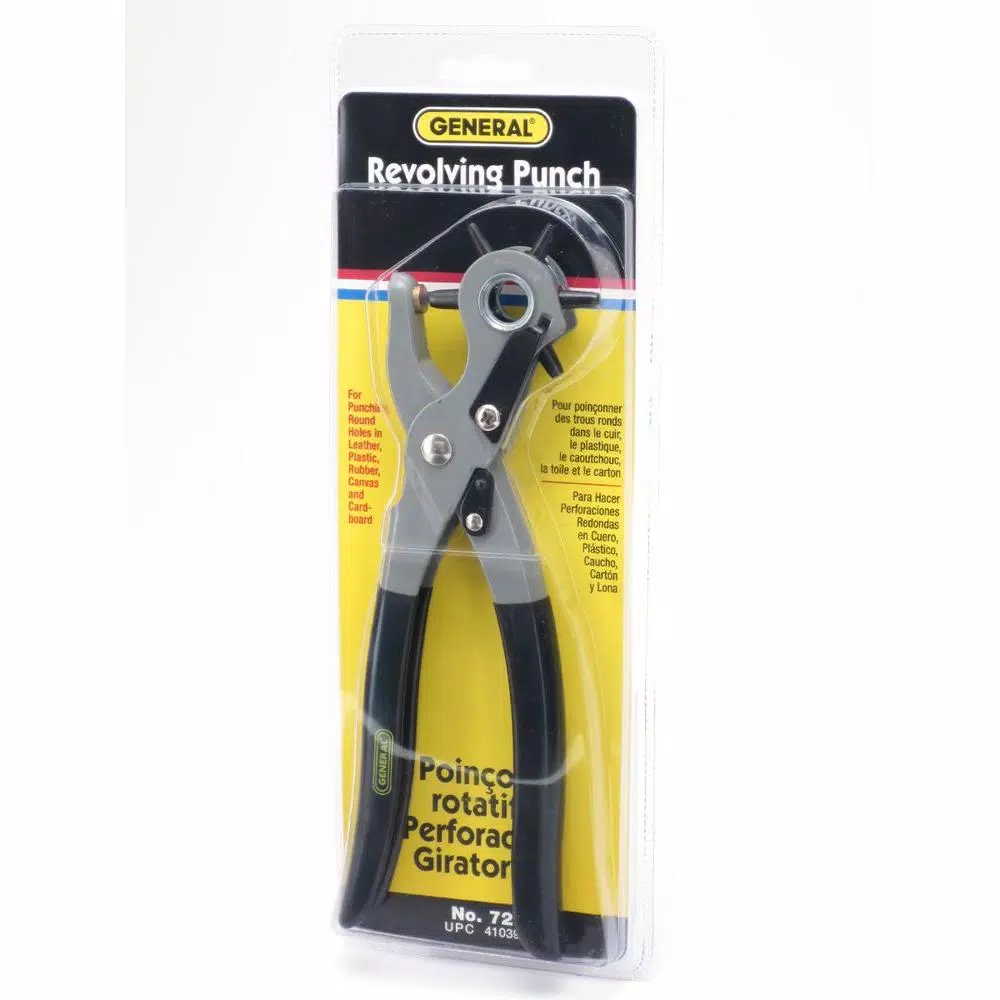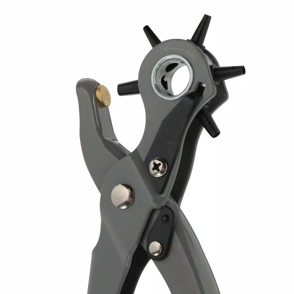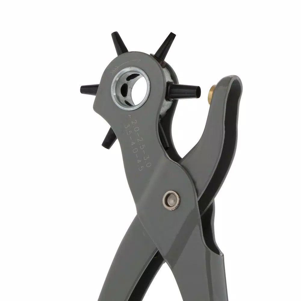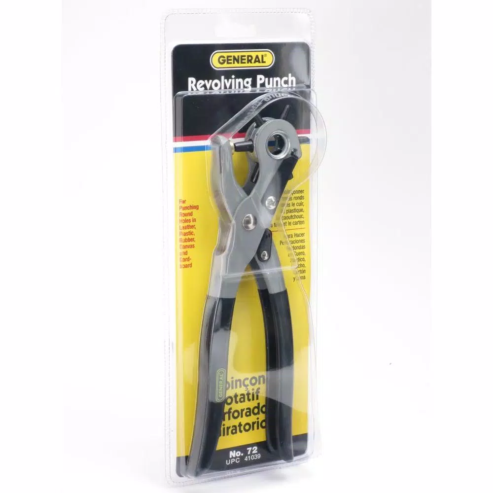 Get a convenient solution for punching round holes in leather, plastic, rubber, canvas and cardboard with the spring-tension, self-opening Revolving Punch Pliers. Constructed of plated steel with 6 tapered and hollow, hardened steel punches with sizes ranging from 5/64 in. to 3/16 in.