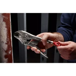 The MILWAUKEE® 4″ TORQUE LOCK™ Curved Jaw Locking Pliers provides users with faster tool setup and more locking force. The pliers’ curved jaw maximizes pressure points for range of applications. The locking pliers’ unique thumb screw provides users with a more convenient geometry for hand force while providing clearance to generate more torque with the screwdriver through-hole design. The pliers are made from forged alloy steel for maximum durability with hardened jaws for increased gripping power, perfect for the toughest of jobsites. Milwaukee offers a Limited Lifetime Warranty on all locking tools.