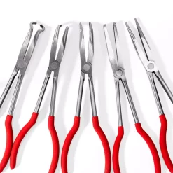 The Stark Long Nose Plier Set includes: 11 in. straight needle nose pliers, 11 in. 25 bent pliers, 11 in. 45 bent nose pliers, 11 in. 90-bent nose pliers and 11 in. 1/2 in. reach hose ring pliers. This long nose pliers set is the perfect tool set for both mechanics and do-it-yourselfers for automotive applications. The longer reach of these long nose pliers makes it ideal for reaching deep into tight spaces or working within limited clearance areas.