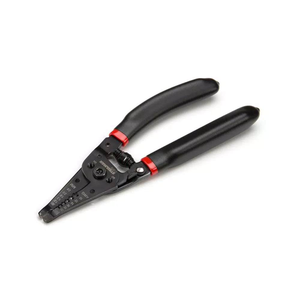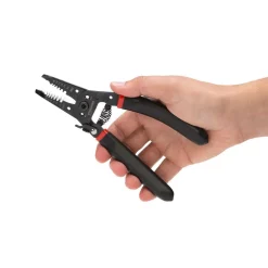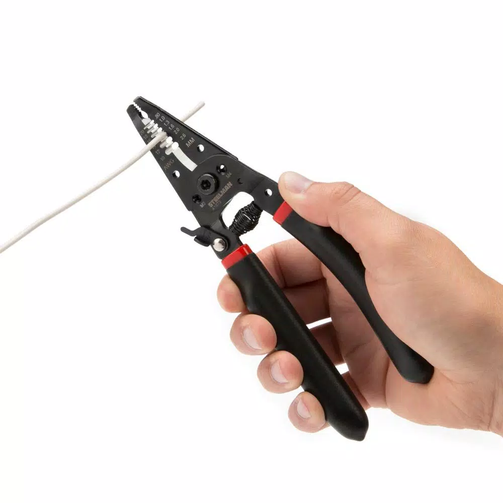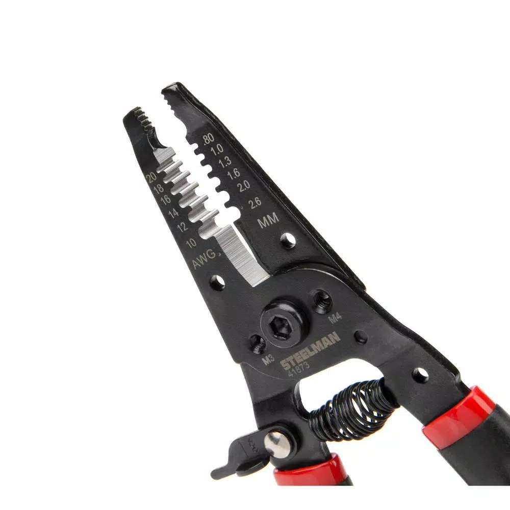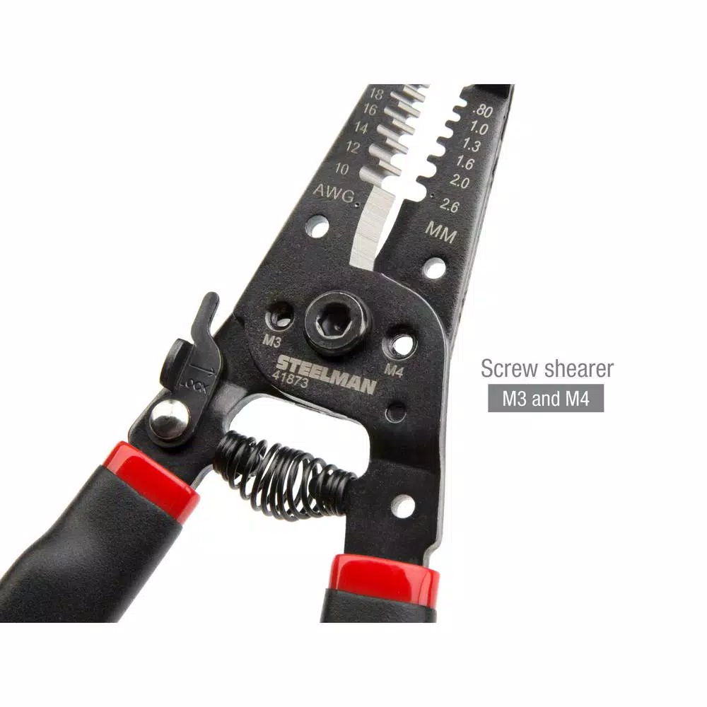 Whether youβre stripping wire to install outlets and lights or just need to replace some damaged automotive wiring the Steelman 41873 Universal Wire Stripper and Cutter is the tool that can help you get the job done. Made from durable steel with comfortable and ergonomically angled PVC dipped and textured handles it cuts and strips equally well on both solid and stranded copper electrical wires. This pocket sized, 7 in. wire stripper can remove insulation from 20 AWG to 10 AWG 0.8 mm to 2.6 mm. electrical wires and the spring assisted opening helps you effortlessly move from 1 wire to the next. The screw shearer is capable of leaving clean, burr-free cuts on screws sized 4-40 and 8-32 (M3 and M4) and the plier style nose gives you the grip you need to pull, twist, bend, pinch, and hold wires and the looping hole allows you to quickly bend hooks into wires for attaching to terminals. When not in use a convenient lock keeps the pliers closed and compact so they donβt get tangled in your tool belt. You donβt need to be a lineman or electrician to have access to quality hand tools, look no further than Steelman.