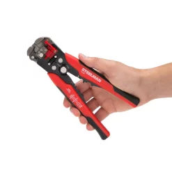 Perfectly and quickly strip insulation from electrical wires every time with the Steelman 41866 Self-Adjusting Wire and Cable Stripper. The toolβs hardened steel jaws will automatically adjust to all but the smallest gauges of insulated wires and with a quick turn of the micro adjustment knob, even the smallest of wires are perfectly stripped without cutting or damaging the wires. The easy, 1-handed operation takes only a single squeeze regardless of wire gauge from delicate 30 AWG to heavy-duty 8AWG wires and the ergonomic PP/TPR handle provides maximum comfort and less strain on your hand. The adjustable wire stop lets you set exactly how much insulation you need removed without having to measure or mark each individual wire. The built-in wire cutter near the pivot point of the tool can cut through 24 AWG to 10 AWG solid or stranded wire. Just below the cutter is a series of terminal crimpers that can accommodate insulated and non-insulated terminals ranging in size from 22 AWG to 10 AWG, and even 7 mm β 8 mm ignition terminals. These near automatic 8 in. strippers are ideal for anyone looking to do wiring work β from a journeyman linesman or professional electrician on the job to a Dyer or regular homeowner looking to do some minor home repairs.