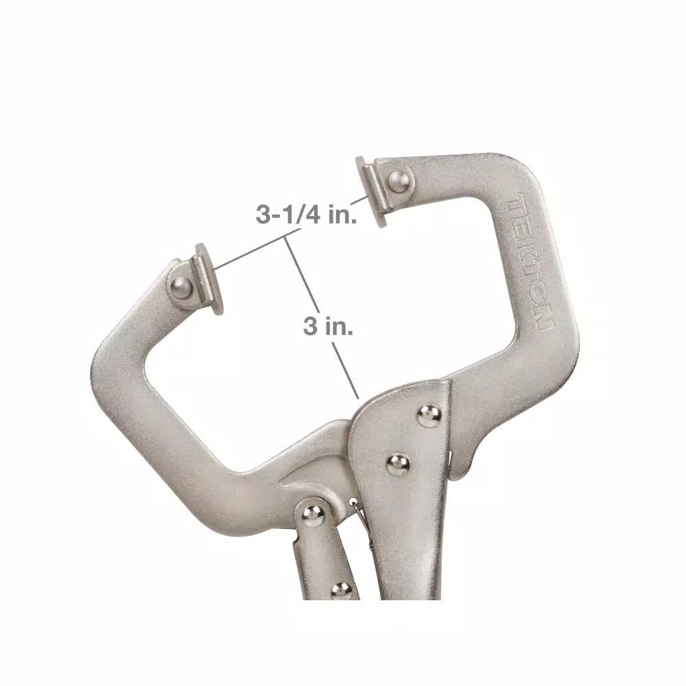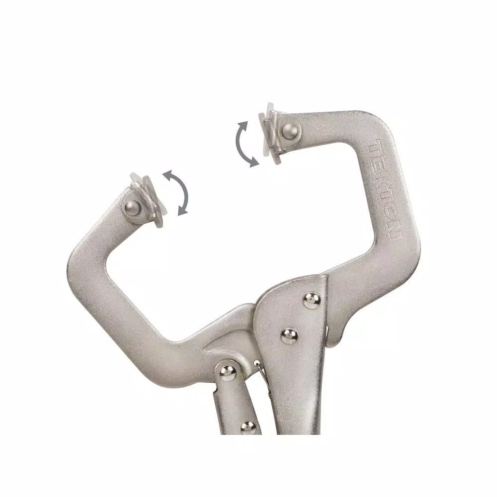 Prevent slipping or misalignment of parts while cutting, fastening, assembling, riveting, or welding with the TEKTON 11 in. Swivel Pad Locking C-Clamp. Set the jaw capacity and the one-handed grip and release action lets you quickly lock, unlock, re-position and lock again so it will not slow you down. It operates easily, even with gloves on. Swivel jaw pads pivot for best fit and grip of angles, edges or uneven surfaces. A chrome plated finish protects from rust and corrosion.