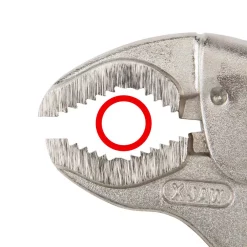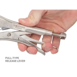 Offering the ultimate nonslip grip, the pivoting jaw shifts forward as it closes, generating extremely high clamping pressure. Set at opposing angles, sharp teeth create a sure, directional bite. The pull-type release lever allows fast and controlled 1-handed operation.